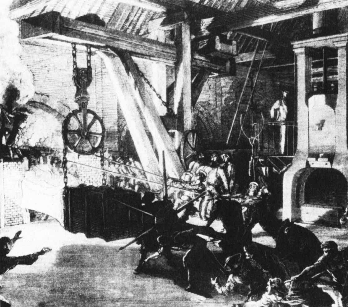 ![]() Dampfhammer eines französischen Eisenwerkes in der Mitte des 19. Jh. Zeitgenössische Darstellung TEXT 23.1.2.b |